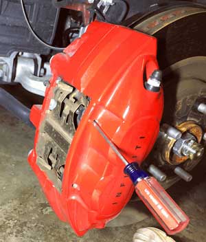 Step 6. In order to make space for the new pads you will need to fully push in the brake pistons. Using a flat head screwdriver, or other flat pry-bar, push against each piston using the